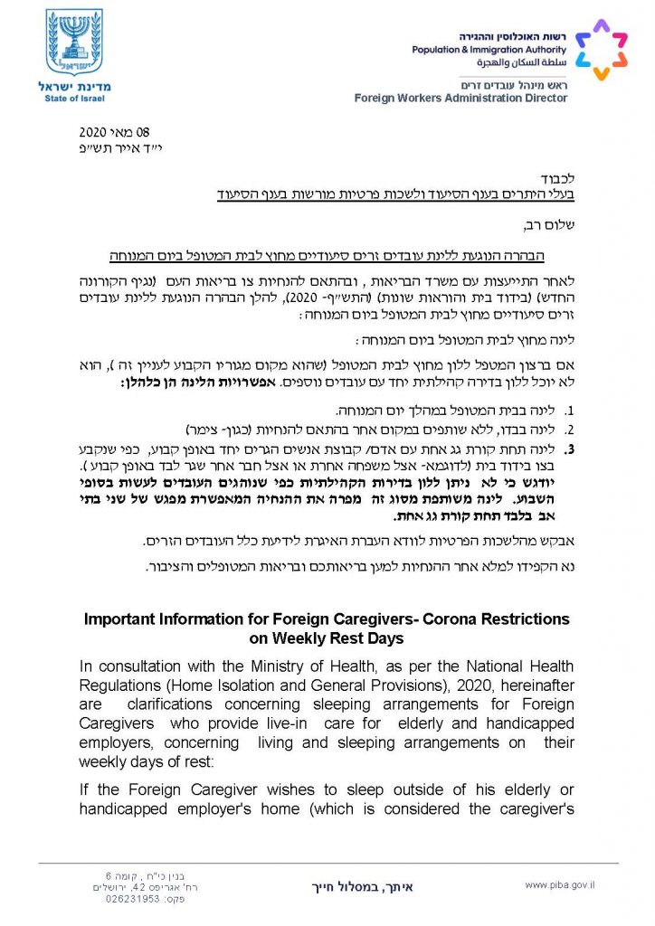 הבהרה הנוגעת ללינת עובדים זרים סיעודיים מחוץ לבית המטופל ביום המנוחה 8.5.2020 – Important Information for Foreign Caregivers- Corona Restrictions on Weekly Rest Days